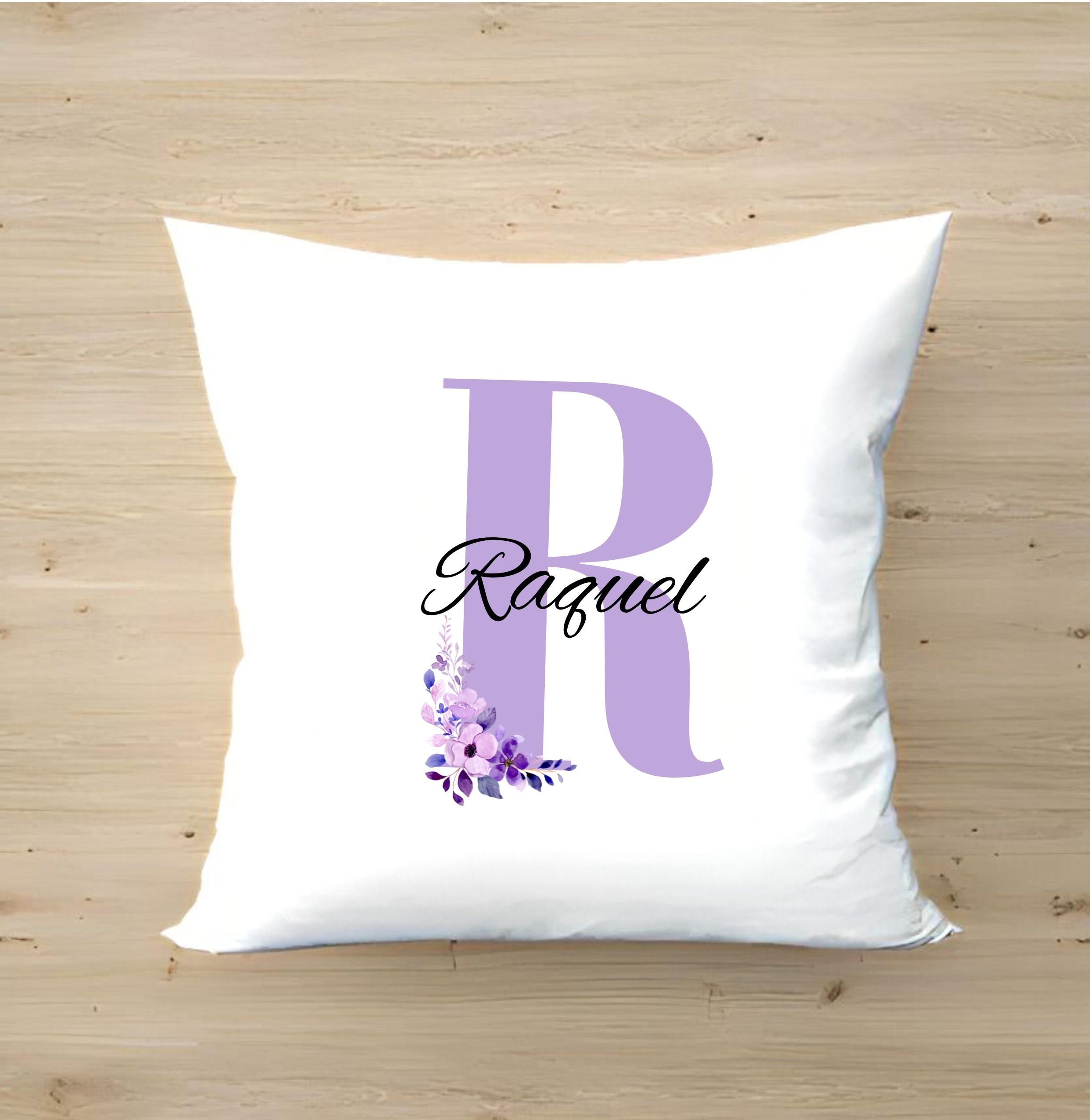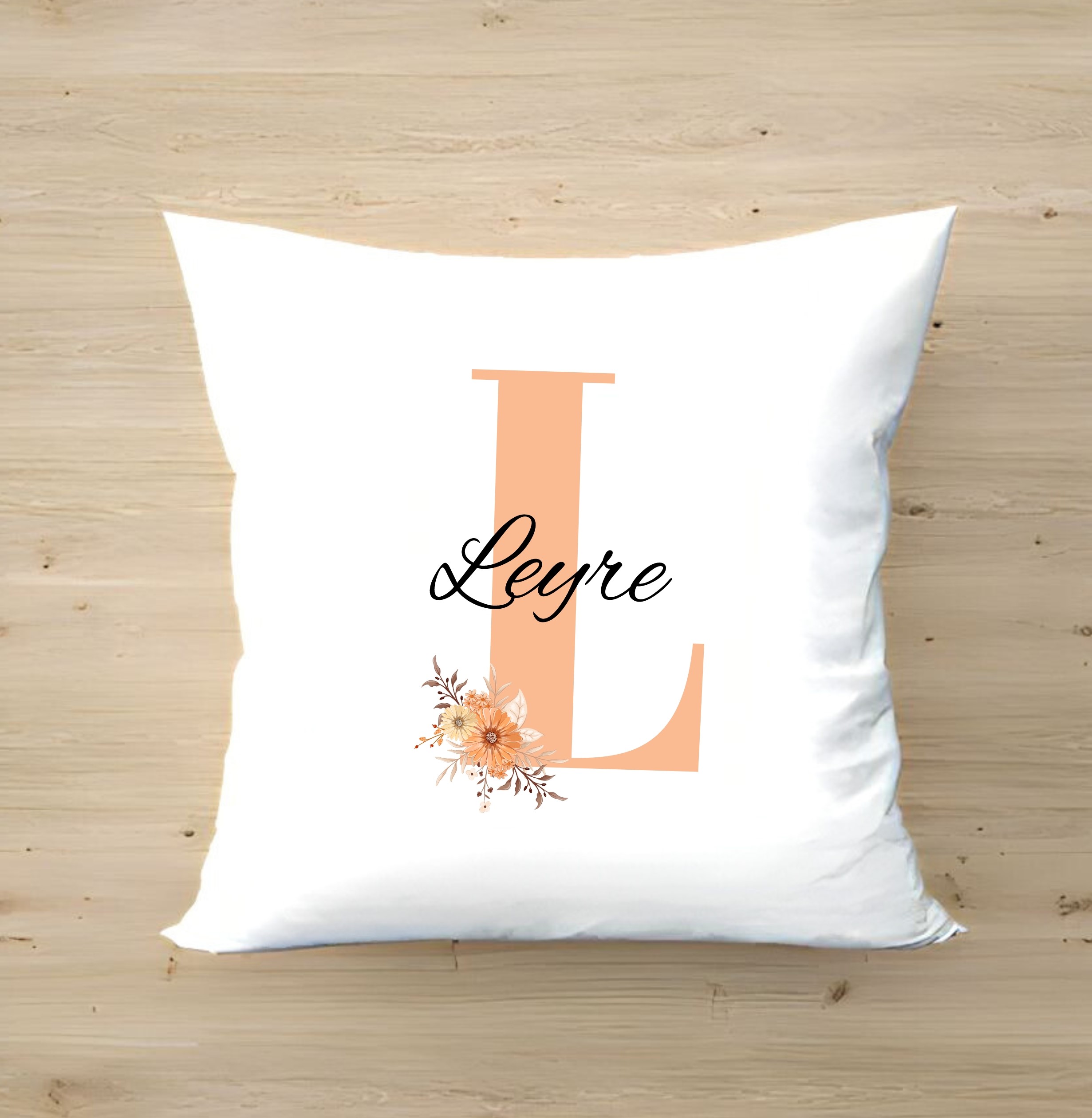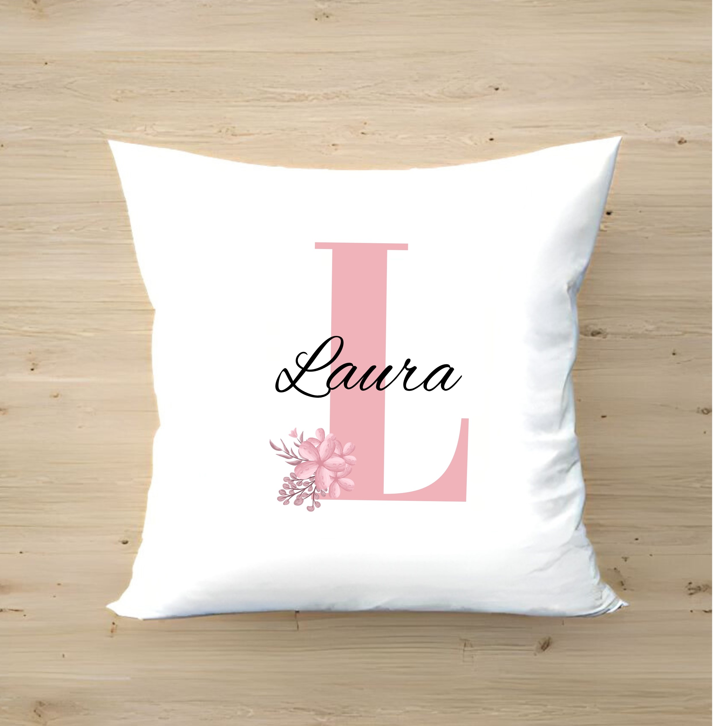 - Cojín -«Nombre entrelazado floral» personalizado con la inicial y el nombre que tu quieras. Un detalle único lleno de personalidad.