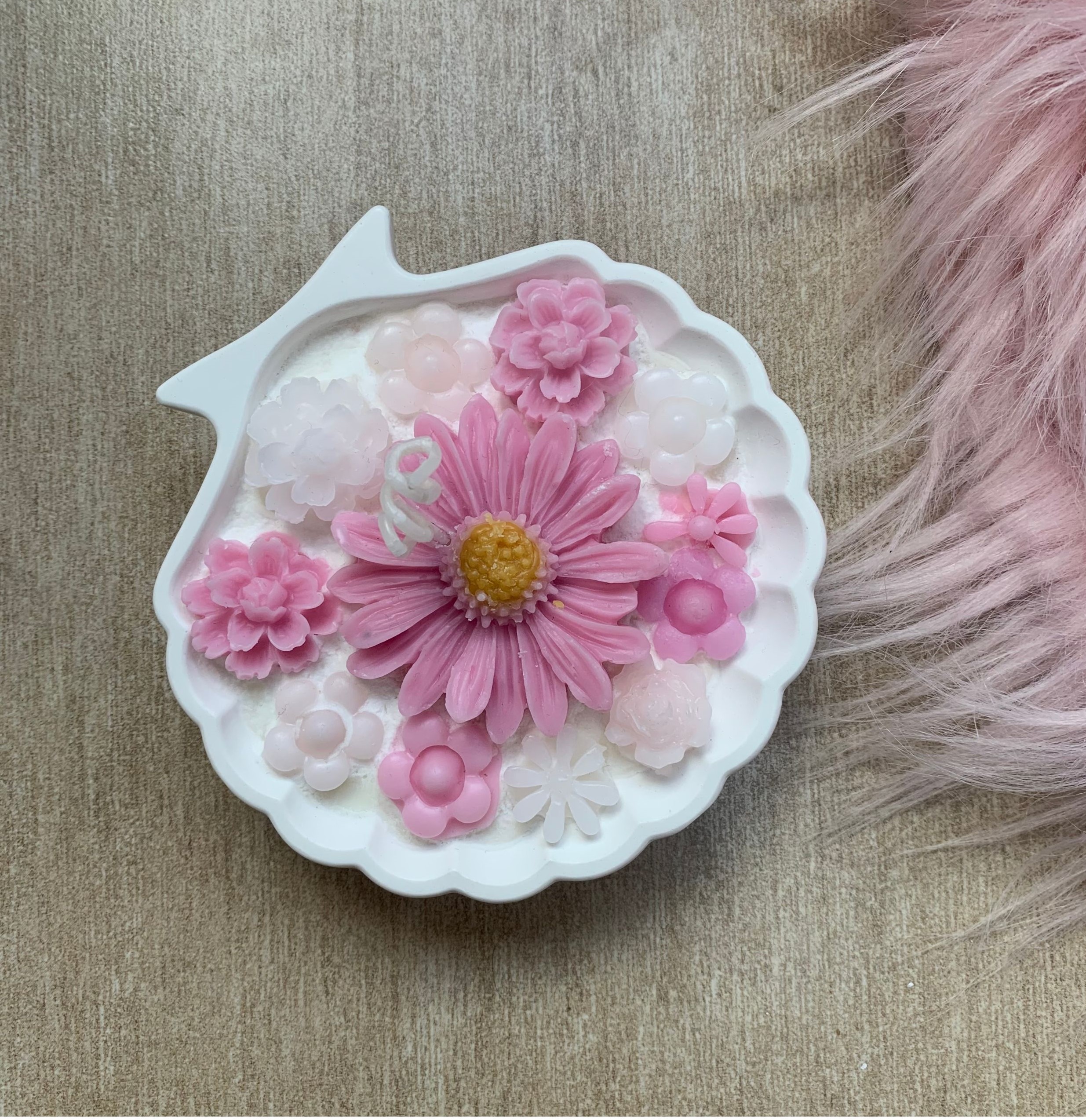 Vela Shell ,compuesta por cera de soja completamente natural, decorada con flores de distintos tonos , sobre soporte en forma de concha.